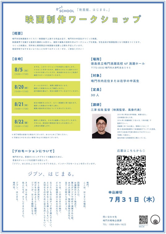 東京で映画やCMなどの制作を手掛ける映像会社(ドローイングアンドマニュアル(株))や映画監督(三澤 拓哉氏)による指導のもと、中高生が脚本制作から撮影、編集までのノウハウを学びながら、「鳴門市内で活躍する・輝く大人」をテーマにしたショートムービーを制作する。