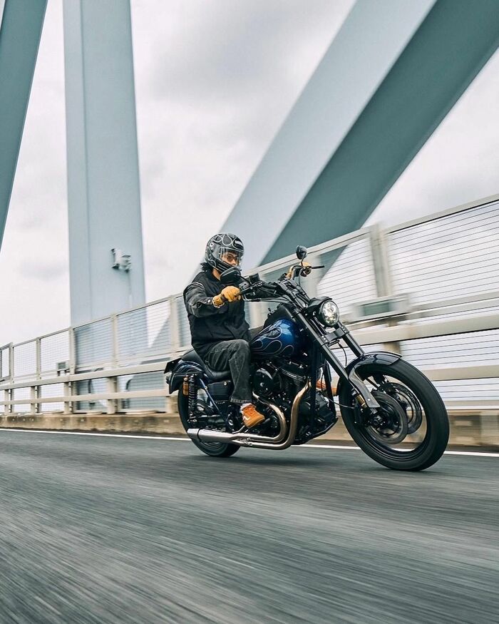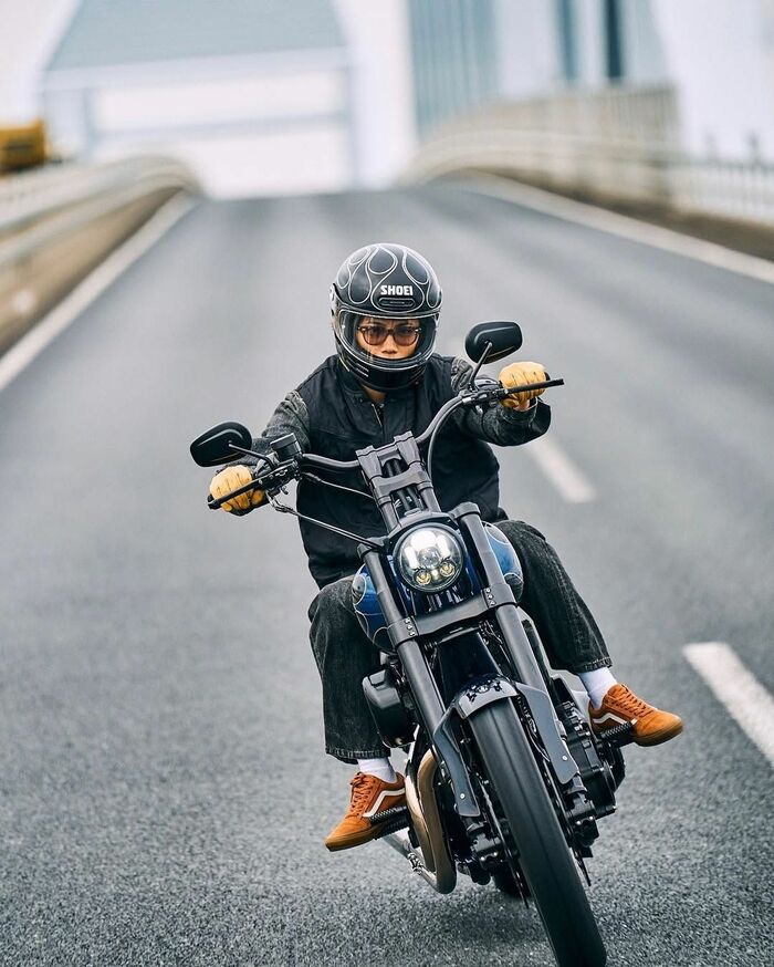ハンドルに片手を置き、ヘルメットのシールドを上げ、顔をのぞかせたショットも披露。