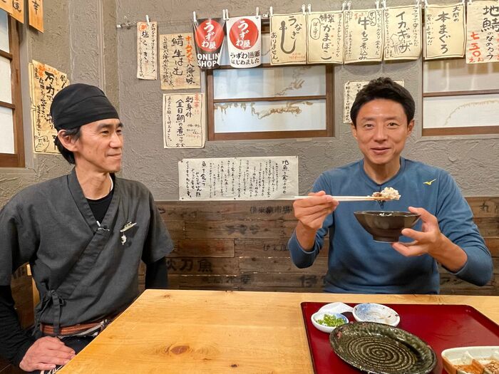 うずわ飯の達人・徳島康生さんから、「鮮度が落ちやすい魚なので、魚屋さんにめったに並ばない」と教えてもらった松岡さんは、さっそく口に運ぶと、「濃厚プラス舌のところに甘い感じが来る」とびっくり。