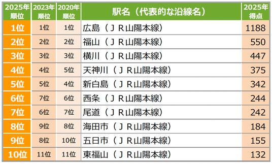 広島県全体と広島市ともに「広島」駅の1位は揺るがず 自治体ランキングでは「広島市中区」が首位を堅持