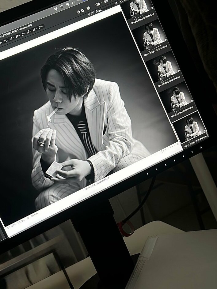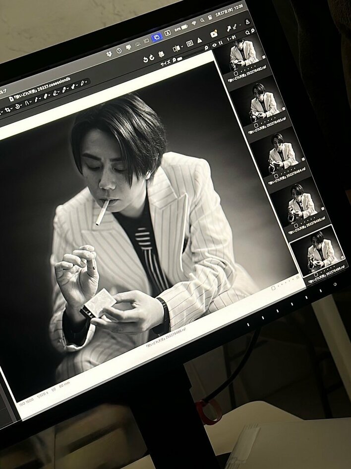 そこには、スーツ姿でタバコをくわえる北山さんが、右手に持つマッチで火をつけようとしている様子が写し出されています。