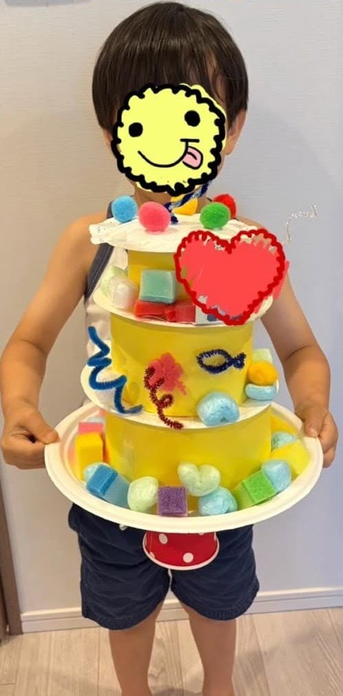 小倉さんとお兄ちゃんたちで作ったのでしょうか。大きな紙皿を土台として、黄色の色紙で3段のケーキを制作。カラフルなモールやポンポン、ハートや四角の飾りでかわいらしくデコレーションされています♪