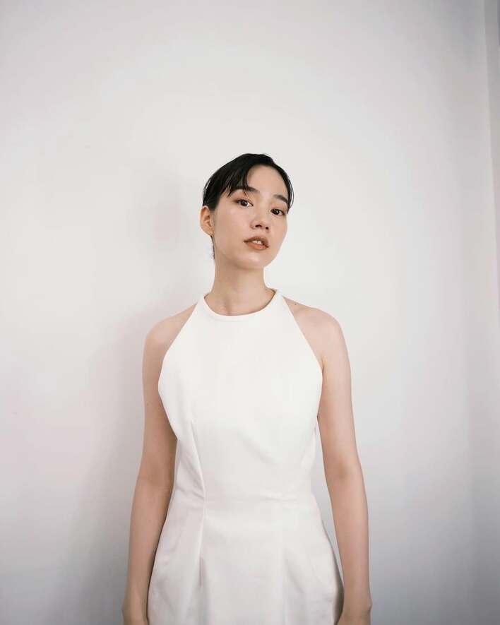 髪をお団子にまとめ、真っ白なホルターネックのドレス姿を披露しています。