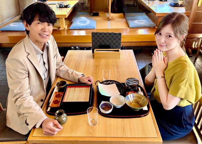 藤木さんと白石さんは、飲食店で向かい合って座り、カメラ目線で笑顔。テーブルの上には、蕎麦などの器が用意されていて、藤木さんはリラックスした様子、白石さんは両手を顎の下で合わせて可愛らしくポーズを見せています。