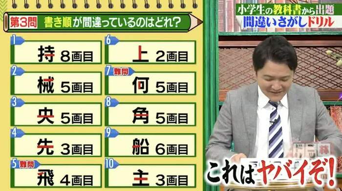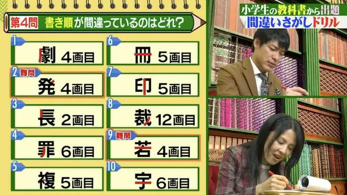 さて、続く第4問も書き順の間違い探し。難問の「発」「若」のほかも、わかりづらいものばかりだが…。