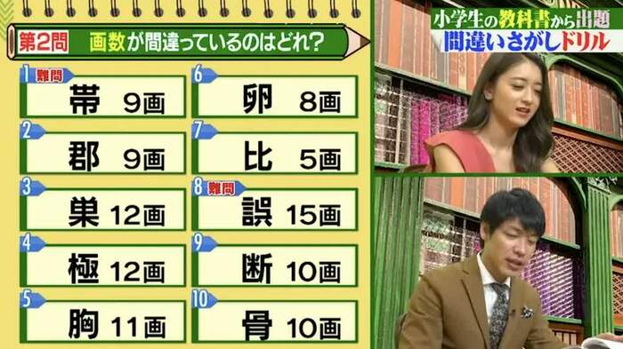 第2問は、パネラーたちを悩ませる画数問題。下の写真の漢字の総画数を、すべて正確にカウントすることはできるだろうか?