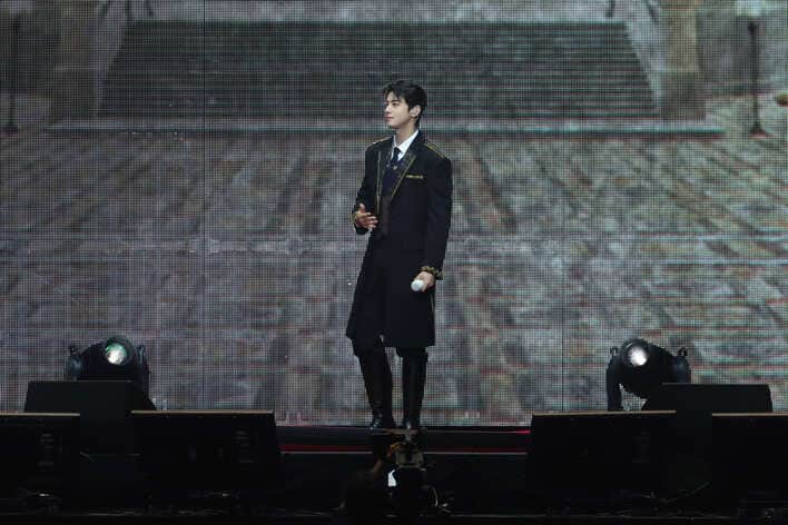 金色の装飾が施された黒いジャケットに黒いネクタイをしめ、たすきのようなものを肩から掛けた装いをしたウヌさん。ファンミーティングのタイトル通り“ROYAL”感あふれる“皇太子”さながらの姿に、会場からは盛大な歓声が送られました。