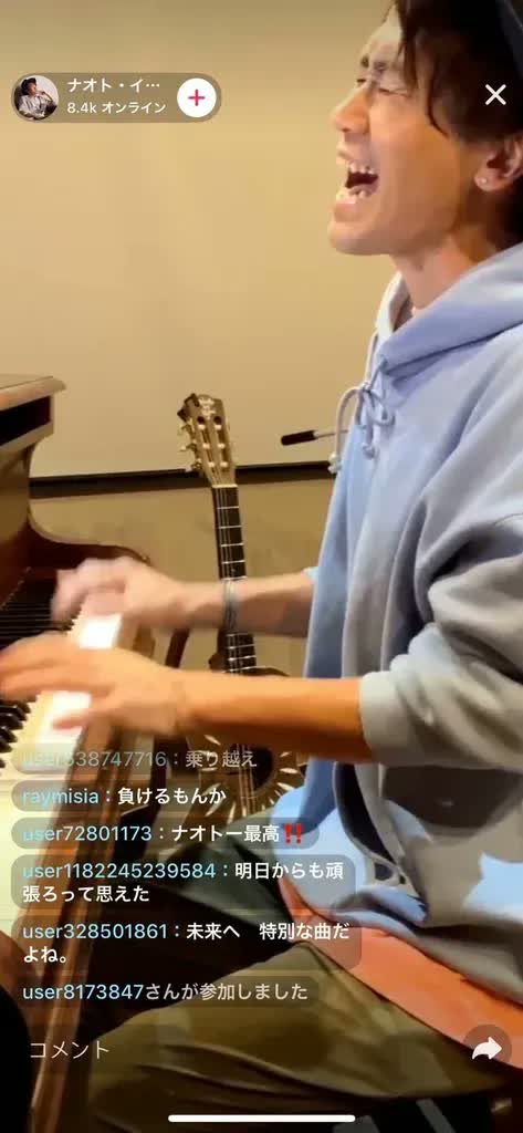 さらにナオトはピアノでの演奏も披露。「『うしろのピアノを弾け』って言うコメントがあった」と言いながら、カメラを先ほどから背景に映っていたピアノ側に移動して、再びファンと「(カメラの)この角度どうですか?」などとやり取りをしながら、一人でセッティング。ファンのリクエストに応えて「Overflows〜言葉にできなくて〜」を歌う。