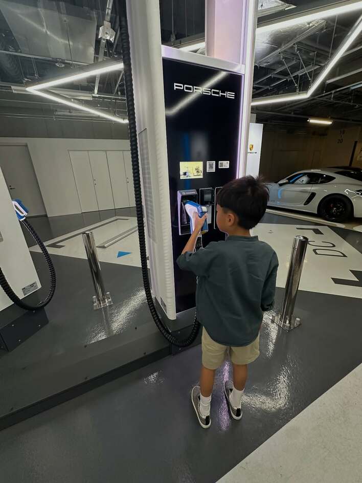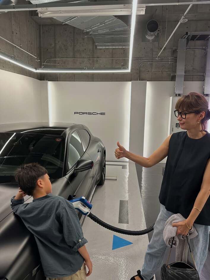 別の写真では、他にもポルシェが止まっている中、次男がお手伝いをしようとしていたのか、駐車場の充電器を手にしている様子も。