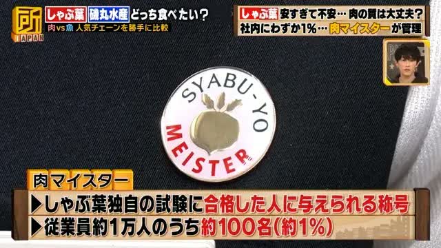 倉澤さんは、お肉の知識と(お肉の)スライスの技術を備えた、従業員約1万人のうち約100名(約1%)しかもっていない、「しゃぶ葉」独自の試験に合格した人に与えられる称号「肉マイスター」をもつ、選ばれし人材。