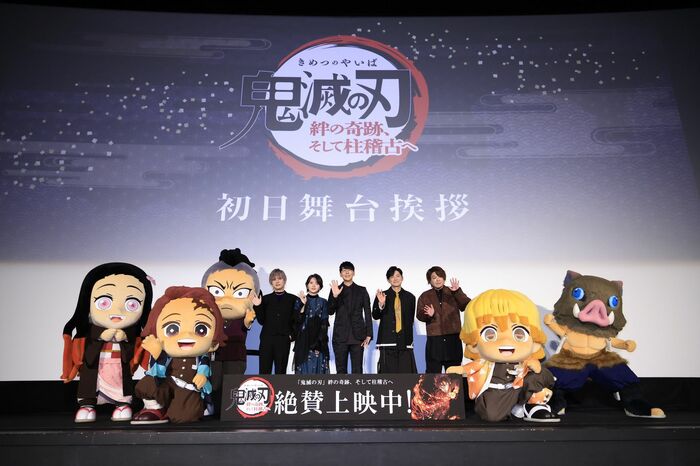 『ワールドツアー上映「鬼滅の刃」絆の軌跡、そして柱稽古へ』の公開記念舞台挨拶が2月2日に行われ、竈門炭治郎役の花江夏樹さん、竈門禰󠄀豆子(ねずこ)役の鬼頭明里さん、我妻善逸役の下野紘さん、嘴平伊之助役の松岡禎丞さん、不死川玄弥役の岡本信彦さんが登場。