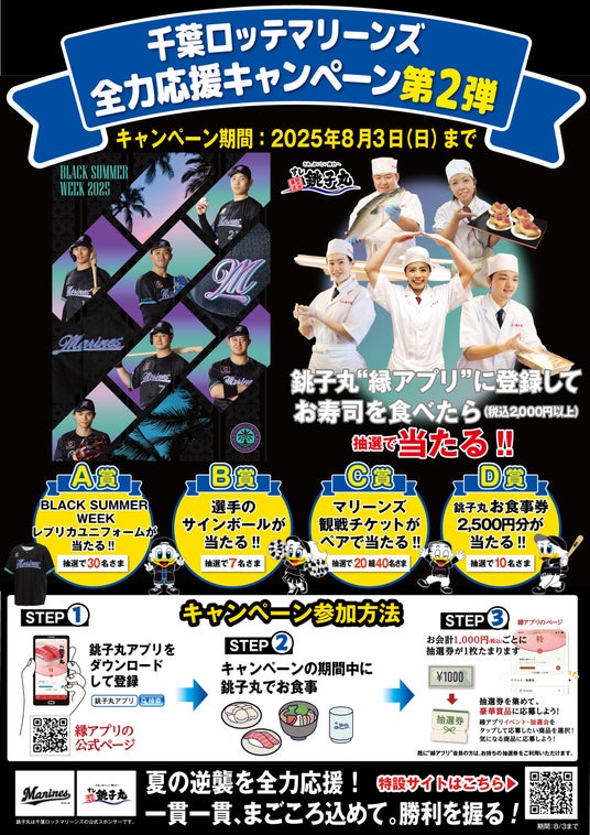 劇場型グルメ回転寿司 #銚子丸 は、千葉ロッテマリーンズを全力応援!銚子丸公式『縁アプリ』から応募して、豪華賞品を当てよう!