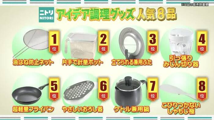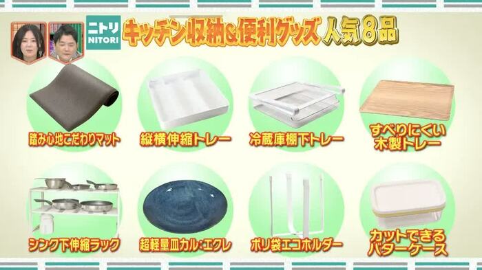 3月16日(水)放送の『林修のニッポンドリル ニトリ1位当て!伍代&水森コンビがお買い物!和食さと番付』では、「ニトリ」の1万点もの商品から「アイデア調理グッズ」「キッチン収納&便利グッズ」など、ジャンルごとの売上1位を発表。