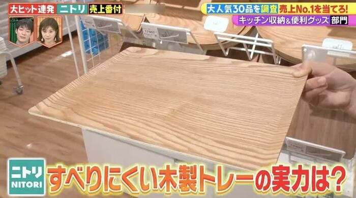 1位は、木の質感が人気で、およそ10種類のバリエーションを展開している「すべりにくい木製トレー」です。