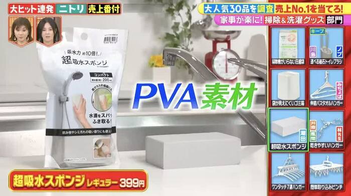 1位を獲得したのは、普通のスポンジの10倍以上という吸水力を誇る「超吸水スポンジ」。