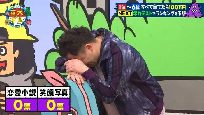 「ユースケごめん、最下位やわ」(ノブ)、「みんなのために頼む!」(大悟)とお願いされ、ユースケさんはしぶしぶ最下位の予想席につきました。