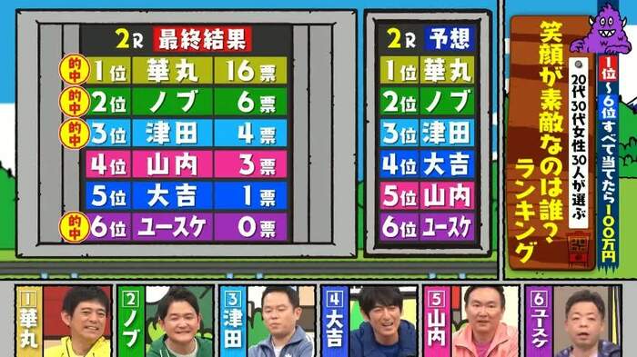 ユースケさんと山内さんのひと悶着があり、予想タイム終了の鐘がなったところで、「ちょっと待って。5位(ユースケ)、6位(山内)これでいい?」と大悟さん。