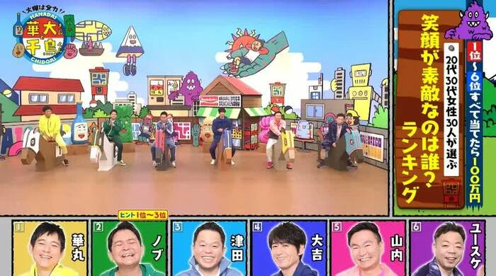 ヒントチャンスでは、ノブさんが上位1~3位の中に入ると判明。さらに4~6位への意見として「作り笑顔に見える」という意見が多かったと明かされました。