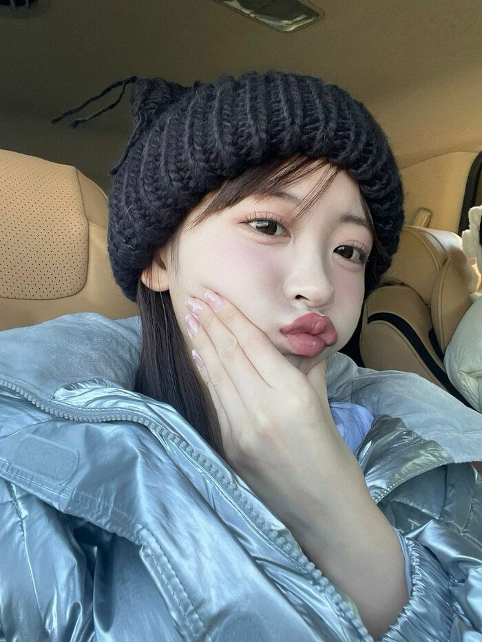 片手で頬をはさんだポーズでカメラを見つめる至近距離の自撮りショットも!