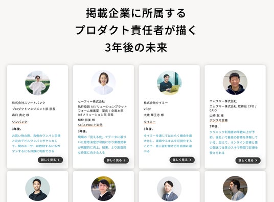 また、正式リリースを記念して、サービス開始記念ページでは初期掲載企業のプロダクト責任者が語る「3年後の未来」メッセージも公開中!