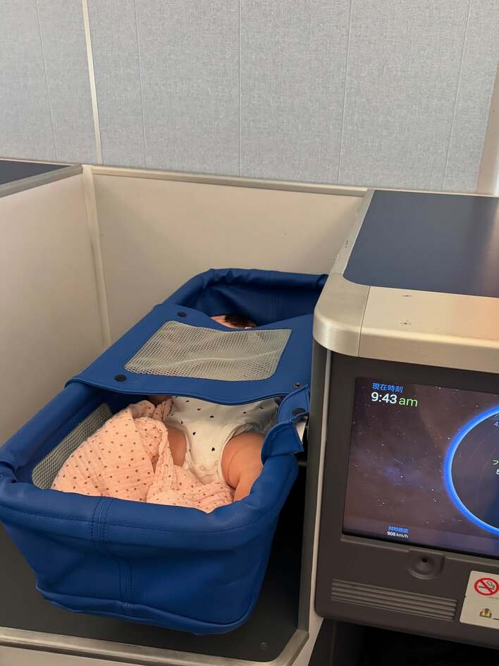 「飛行機は初めて、10キロ以下の赤ちゃんが使えるバシネット付きの席にしました ここで寝てくれるか不安だったけど、次女はぐっすり寝れたよ」と、明かした菊地さん。