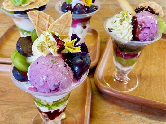 収穫した持ち帰り用ぶどうを使って、オリジナルのパフェ作り体験ができます。
