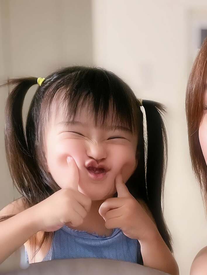 さらに、ニコッと満面の笑みを浮かべた口元を指したポーズをする“姫ちゃん”と、再び頬を密着させる姿を見せた鈴木さん。“姫ちゃん”の笑顔から、ママのことが大好きな様子が伝わってきます。