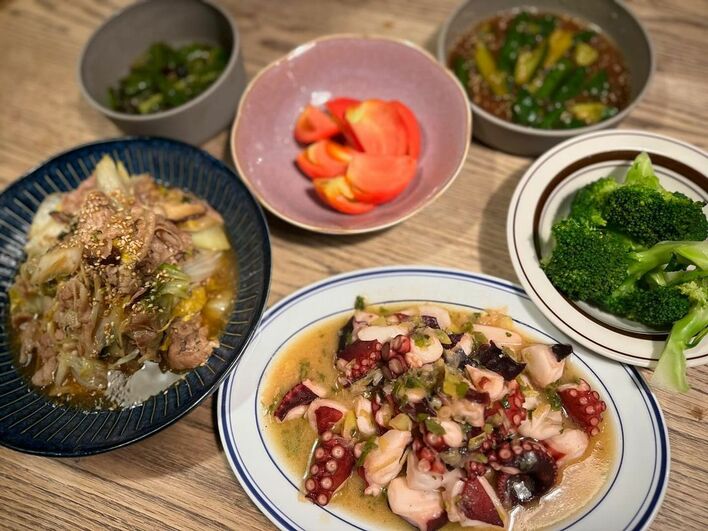 食卓には肉や魚、野菜などバランスが整った色とりどりのメニューが並んでいます。