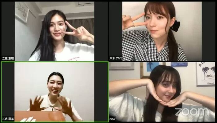 フィナーレとなる21時10分からは、石田ニコル主催のリモート女子飲み会「石田ニコルのみんなで乾杯!!初♡リモート飲み会開催!!」を配信。三吉彩花、八木アリサ、立花恵理、中村里帆、石田夢実が参加し、普段の仲のいい様子が垣間見れるラフなトークを繰り広げた。