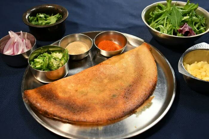 「どうなんだろう?どんな味?」と不安そうな顔をしながらアツアツのドーサを手に取り、残り5秒でかぶりつくと、チーズの糸を引きながら「ふぉんふぁあふぃぃ?」と言葉にならない感想であえなくタイムアップを迎えました。