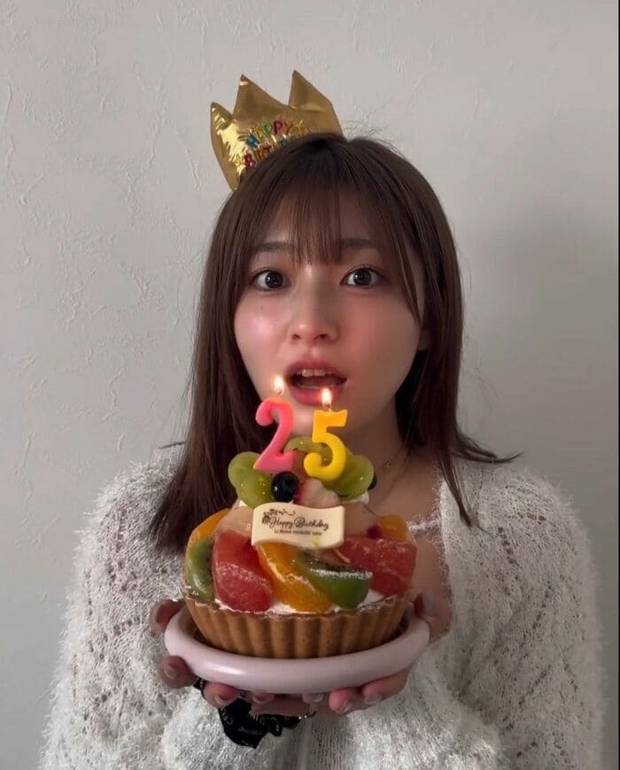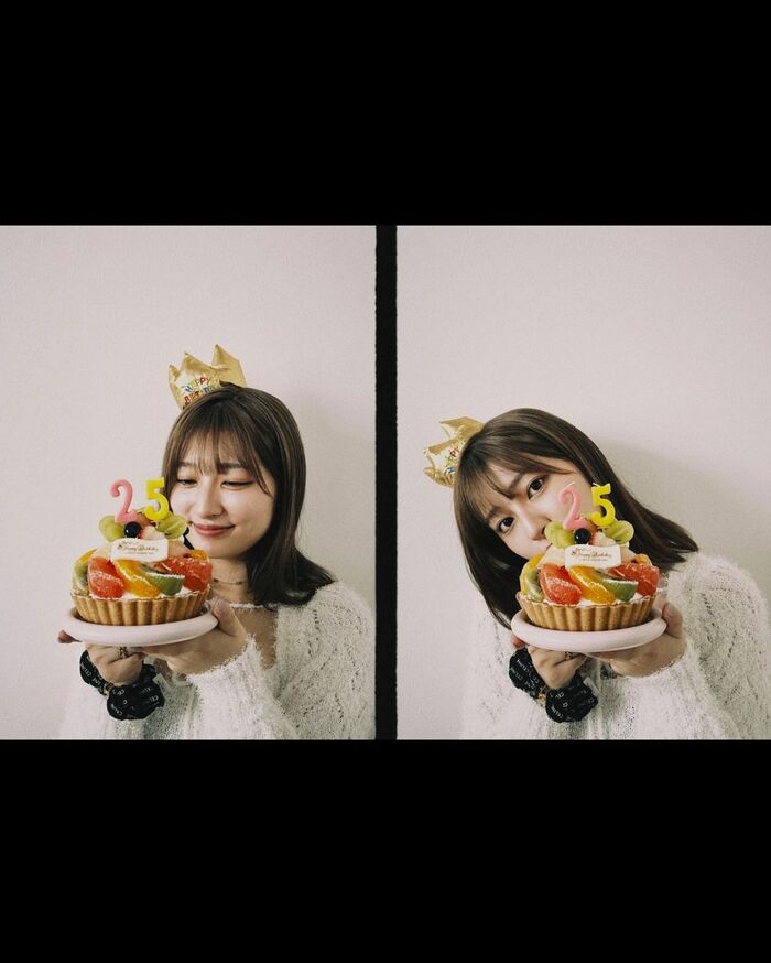 「HAPPY BIRTHDAY」と書かれた金色の王冠の髪飾りをつけ、「2」と「5」のろうそくが刺してあるフルーツタルトを持っているショットや、