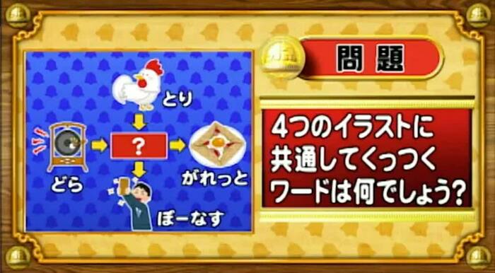 最初は「脳ミングアップクイズ」から、くっつきワードの問題。次の4つのイラストに共通してくっつくワードを答えてください。