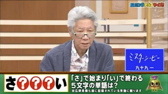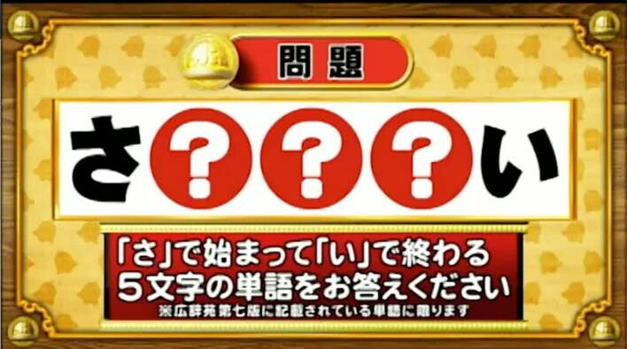 最初は「脳ミングアップクイズ」から、頭とお尻言葉の問題。「さ」で始まって「い」で終わる5文字の単語を答えてください。