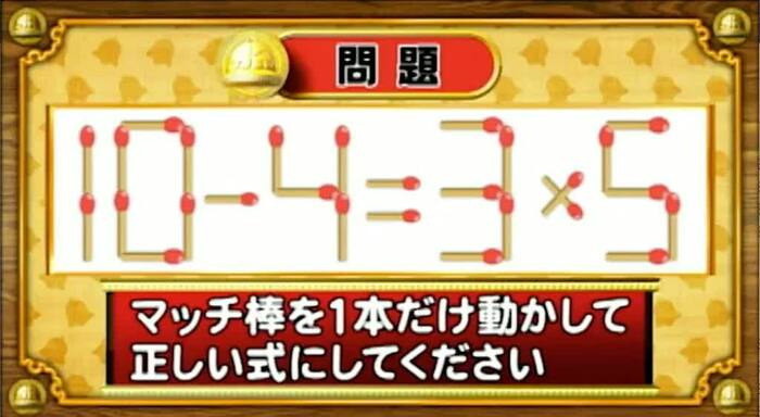 次は、マッチ棒問題。次の式のマッチ棒を1本だけ動かして正しい式にしてください。