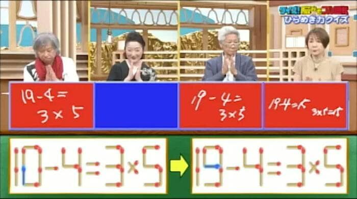 正解はまず、左の式の「0」から1本を動かし「9」にします。そうすれば「19-4=3×5」となります。三沢さん、九十九さん、奈美さんの3人が正解!