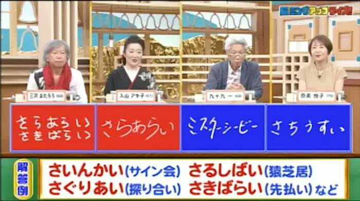 正解は「さいんかい(サイン会)」「さるしばい(猿芝居)」「さぐりあい(探り合い)」「さきばらい(先払い)」など。三沢さんと入山さんが見事正解。