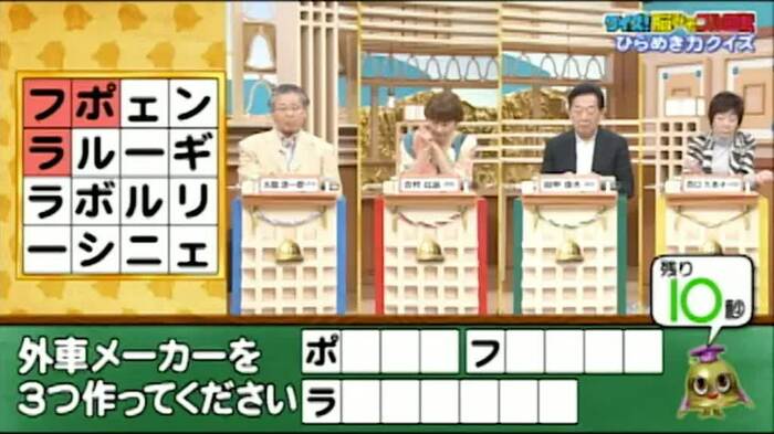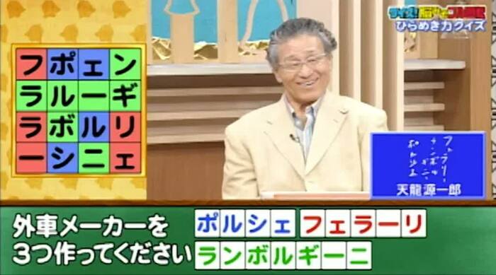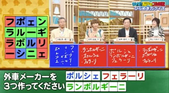 天龍さんの答えは、「フェラリー」「ランボルギニー」「ポルシェ」。微妙に語尾が違っているので残念ながら不正解。