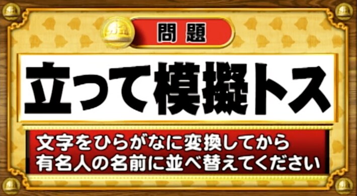 最後は、シャッフル人名の問題。次の文字をひらがなに変換してから、ある有名人の名前に並べ替えてください。