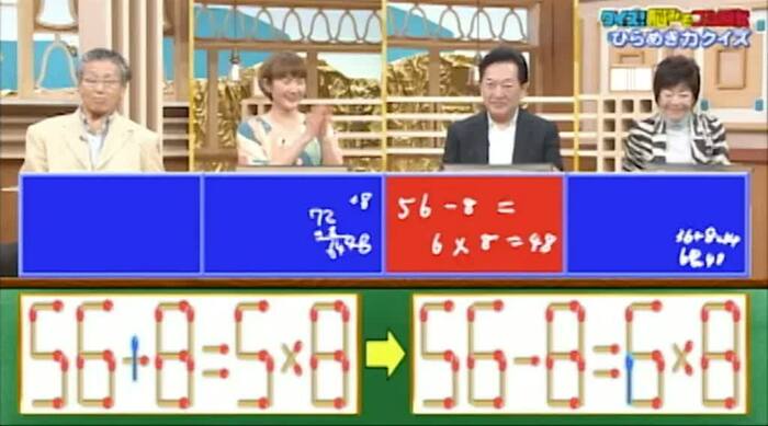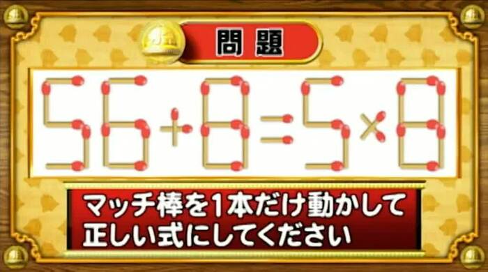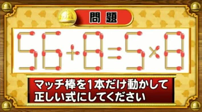正解はまず、左の式の「+」から1本を動かし「-」にします。その1本を右の式の「5」に足して「6」にします。そうすれば「56-8=6×8」となります。田中さん1人が正解!