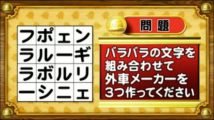 次は、外車パズル問題。次のバラバラの文字を組み合わせて外車メーカーを3つ作ってください。