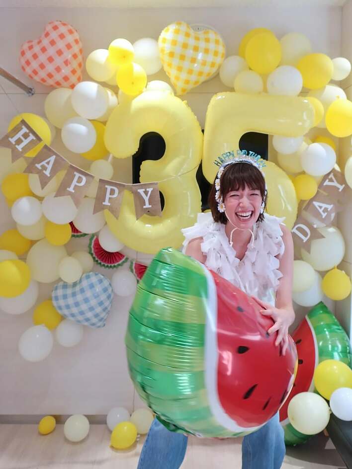 後ろには、“HAPPY BIRTHDAY”のフラッグと“35”のバルーンが!さらに、周りもギンガムチェック柄のかわいらしいハートや、黄色や白のバルーンで豪華に装飾されています。