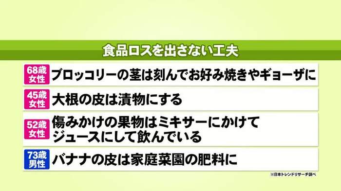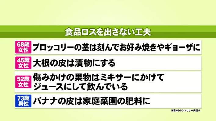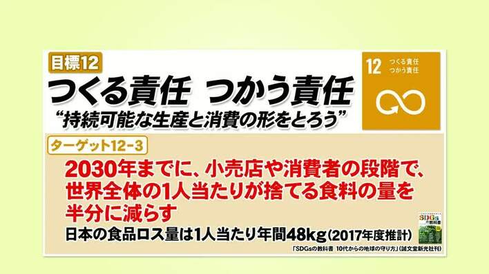 具体的な行動目標の一つである「食品ロス」を出さない工夫が紹介されると、千秋さんは「少し割高でも、使いきれるように少量のものを買う」と考え方と行動を変えたと告白。