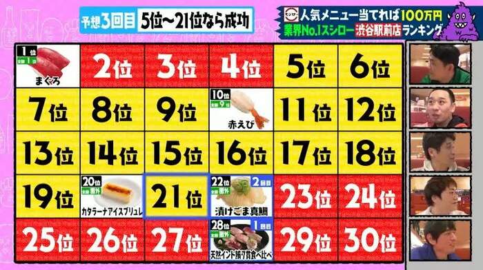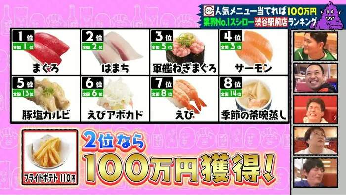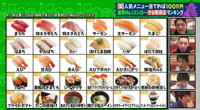 回転寿司チェーン「スシロー」では、「渋谷駅前店メニュー売り上げランキング」を予想しました。