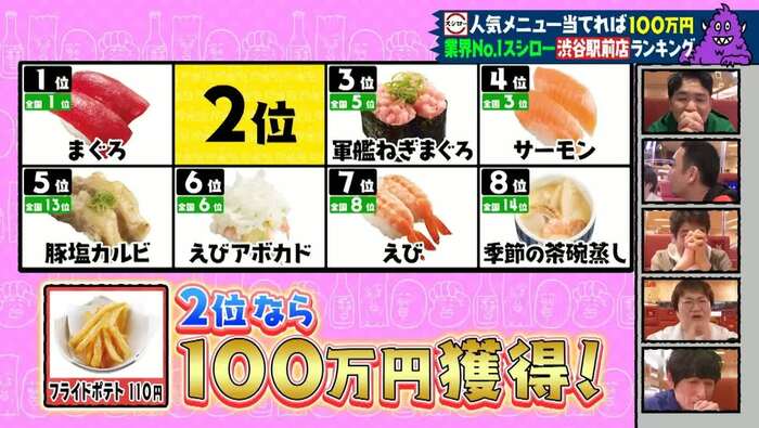 ノブさんは「僕知ってますよ。若い子は、スシローでフライドポテトを食うのがブームになってるんすよ」と自信ありげ。近藤さんも「ポテトめっちゃ上だと思うんですよ」と乗っかりました。