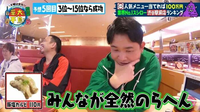 5人は、ノブさんのイチオシ「豚塩カルビ」を試食します。大悟さんは「うまっ」と驚きましたが、「上位でもおかしくないけど、男かな。女の子はあんま取らんかな」と予想。