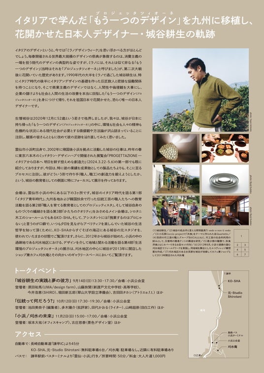 デザイナー城谷耕生(1968-2020)の創造活動の根幹には、現代の商業主義的なデザインとは一線を画す、イタリアンデザイン初期の思想と実践(プロジェッタツィオーネ)がありました。それは、社会性と倫理性に富み、企業の利益よりも共同体のための創造と市民全般への教育を使命としていました。この思想をイタリアで学んだ城谷は、帰国後、故郷の小浜町に拠点を定め、九州各地の伝統工芸職人たちとの共同作業や地元小浜の刈水地区の地域づくりなどにおいて貴重な仕事を残しています。本展は、彼の業績を振り返り軌跡を辿りながら、これからの社会における、生き抜く力としての創造力の方向性を問い直すものです。