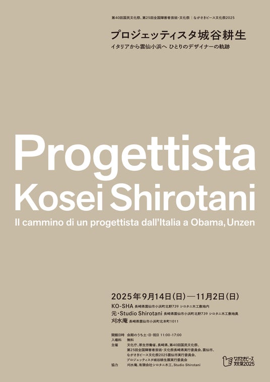 2025年9月14日(日)より、ながさきピース文化祭2025の一環として、展覧会「プロジェッティスタ城谷耕生-イタリアから雲仙小浜へ ひとりのデザイナーの軌跡」を開催します。本展は、2024年に東京ミッドタウン・デザインハブで開催された企画展「PROGETTAZIONE (プロジェッタツィオーネ) イタリアから日本へ 明日を耕す控えめな創造力」を引き継ぎ、城谷耕生の地元・長崎県雲仙市小浜町で、その作品と活動により深く焦点を当てた内容となります。