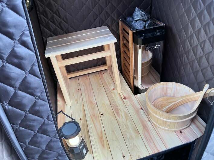 テントサウナには、1人用のイスやロウリュも置かれていて本格的なサウナにご満悦な様子だった和田さん。