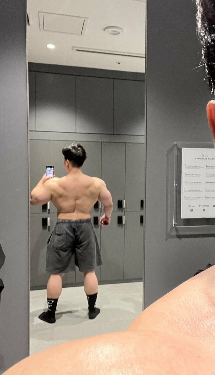 そこには、ロッカールームの鏡越しに背中を自撮りする上半身裸の横川さんの姿が。