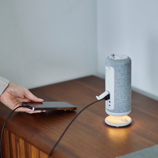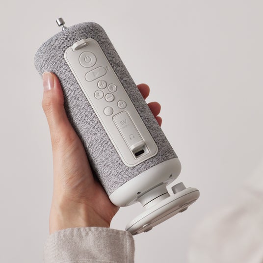 インテリアになじむスタイリッシュなルックスで、災害時にはラジオに切り替えられる充電式のBluetoothスピーカーです。こう見えて防災グッズ。しまい込まず、毎日使いたくなるようなデザインなので、災害直後の動揺が激しいときでも使い慣れているスピーカーをラジオに切り替えれば情報が得られます。操作は簡単で、懐中電灯も内蔵されていて心強い限り。日常では、落ち着いた質感とコンパクトな佇まいで、どんなインテリアにも自然と溶け込みます。夜はキャンドルのような柔らかなライティングモードが特におすすめで、テーブルやデスク上が高級感ある雰囲気に。お気に入りの音楽をかけながら、ゆったりとした時間を過ごせます。